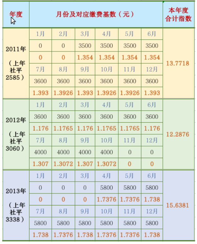 经过计算,2011-2013年这3年的按月指数和为41.6975,3年累计缴费月数29个月(10+10+9=29),所以这3个的平均缴费指数为:41.6975÷29=1.4378