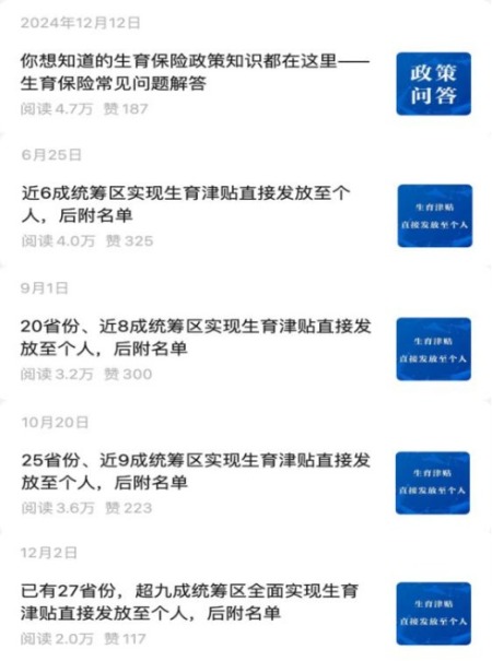 12月初,全国27个省份、95%统筹区全面实现生育津贴直达个人。