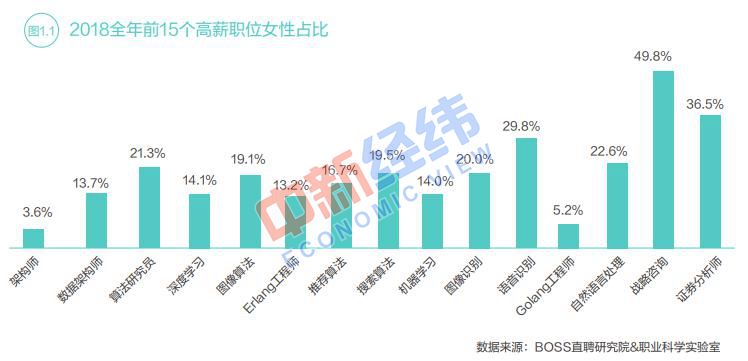 在2018全年前15个高薪岗位的女性占比中,除了排在第14位和第15位的战略咨询及证券分析师外,其余岗位女性占比普遍在30%以下。目前技术领域热度最高的机器学习、深度学习、图像识别、架构师等人工智能和大数据相关岗位,女性占比不足20%,甚至是个位数。女性在高薪技术类职位中的低参与率使得薪酬差异日益明显。而近年来,各领域商业模式红利减弱,行业巨头转向技术驱动,高级技术岗位薪资持续飙升,进一步强化了相关领域内高收入男性的薪酬优势。