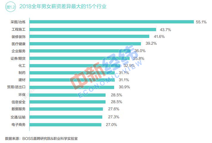 从行业上看,男女薪酬差距较大的领域主要集中在采掘冶炼、化学等工程制造类行业。这些领域中,男性因拥有生理优势,在劳动参与率和职级晋升方面均显著占优。2018年,工程制造领域的高级管理职位中男性平均占比超过95%,高层职位男女比例严重不均导致双方薪酬差异处于高位。